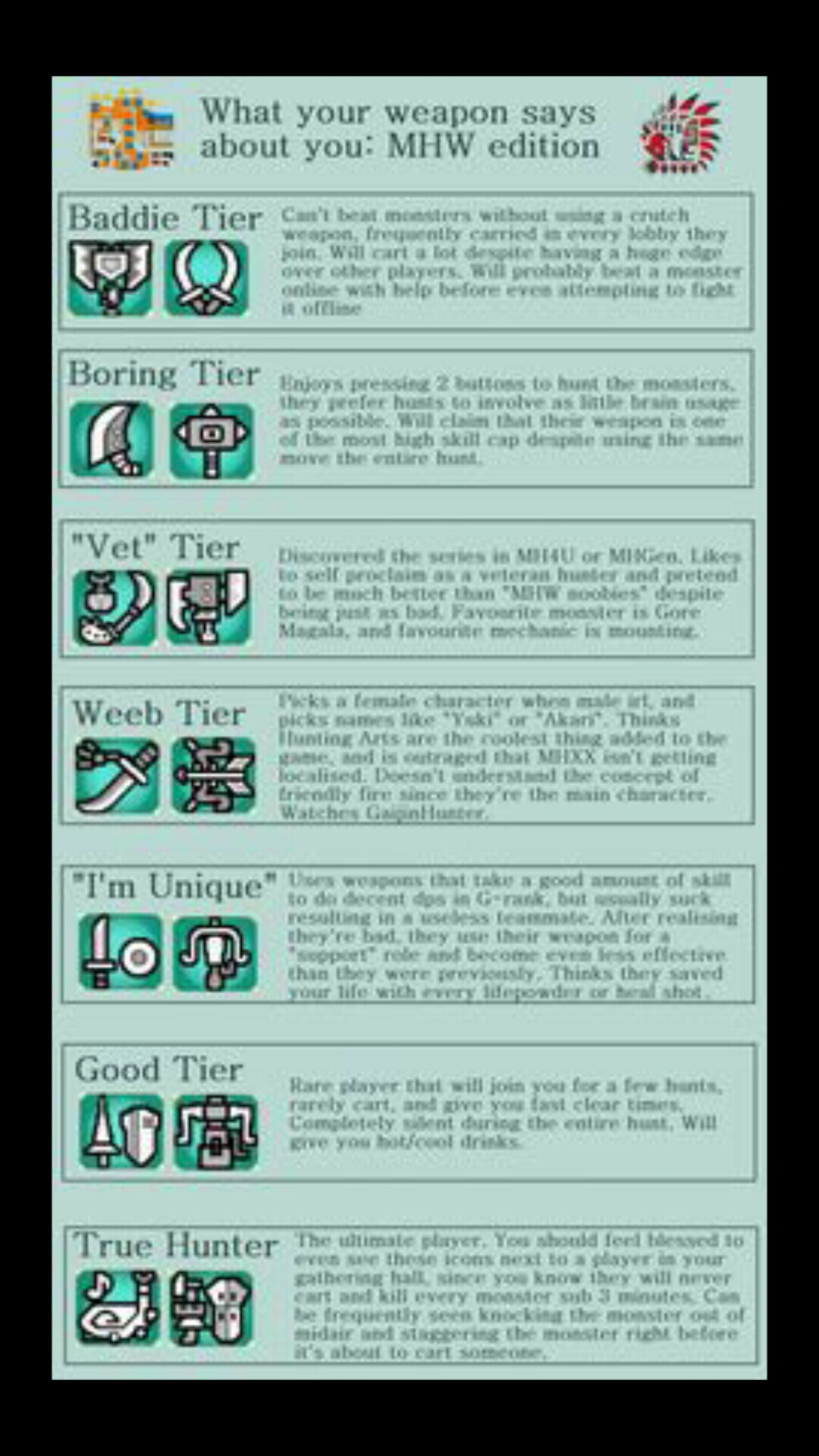We have sorted the weapons list into tiers for solo and co op mode in mhw. The monster hunter weapon tier list. This is a very long write up so please just find the weapon that you like and see where i placed it if you dont feel like reading everything. Im also basing this tier list on efficiency and ease in a hunt once you have the right build going. Let me preface by saying that all the weapons are viable and with end game gear no weapon will be left in the dust. Weapons guides coming soon ultimate guide to bows ug2b features.