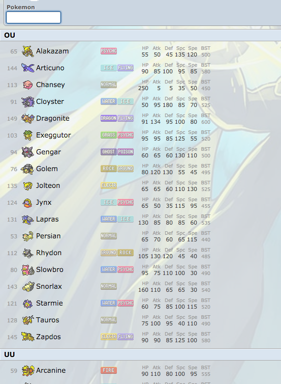 Ou tier s rank the big 4these pokémon are very difficult to counter with no significant weaknesses or if they do have weaknesses they make up for it with significant upsides and utility. Cookies pokemon online will be adopting smogon tiers. I agree that slowbro should top its tier however. For each pokémon for each base stat their stat is normal stat 10 x 1 where the pokémon is in the u or p tier. Example gold and silver have kanto but all the gym leaders except blue are poorly designed with weak pokémons and red is only hard because of artificial level spikes. Rby ou viability ranking.